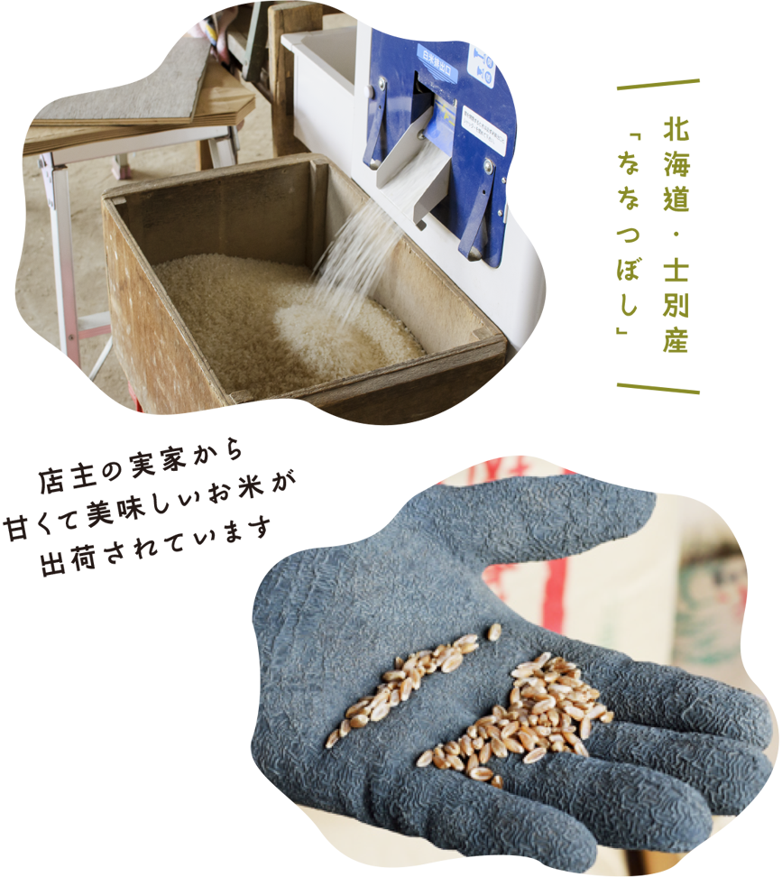 当店で使用しているお米は、北海道士別市の店主の家族が心を込めて育てた「ななつぼし」を使用しております。北の大地の恩恵を受け、愛情込められて育てられたお米は秋に収穫された後、籾殻(もみがら)が付いたままの状態で保存されます。籾殻に包まれたお米は、水分の蒸発が防ぎ安定した水分量となる為、常に新鮮な状態でお米を保存できるのです。各店から注文を受けた後、籾摺り(籾殻を取り除き、玄米にする作業)をし、玄米にした後、自家精米し、白米になり、出荷されるのです。常に新鮮なお米を提供する為に、この様な過程を経て各店へ納品されます。侍.のお米は、スープへ浸したときの相性をよくするために白米と玄米をブレンドし、やや固めに炊き上げてあります。玄米は、食物繊維・ビタミン類・ミネラル・鉄分・カルシウムなどが、白米の約3倍も含まれています。栄養満点なうえ、適度なバランスで配合された玄米のプチプチとした心地よい食感がアクセントとなり、スープカリィとの相性は抜群です。